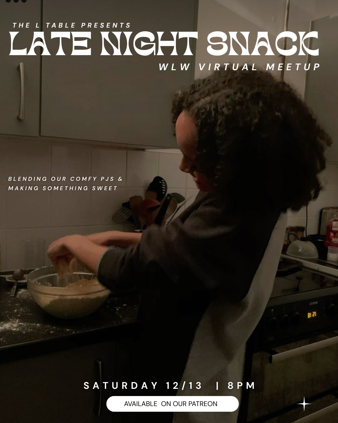 Join our Patreon members-only virtual meetup created for lesbians like you across the country who want to connect over a late night snack. This cozy online gathering is the perfect place to share stories, laughs, and build new friendships from the comfort of your home. Whether you're new or a seasoned member of the community, grab your favorite bottle and let's toast to great company and meaningful connections!